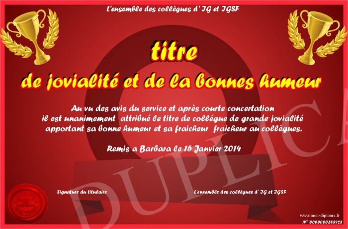Envoyez par email votre titre de jovialité et de la bonnes humeur personalisé