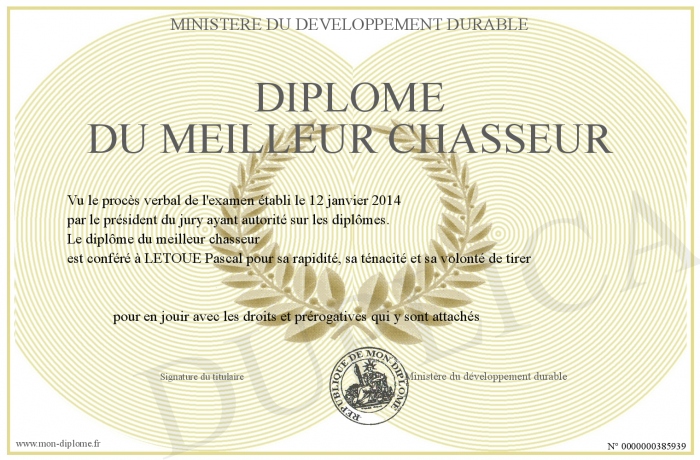 Envoyez par email votre Diplôme du meilleur chasseur personalisé