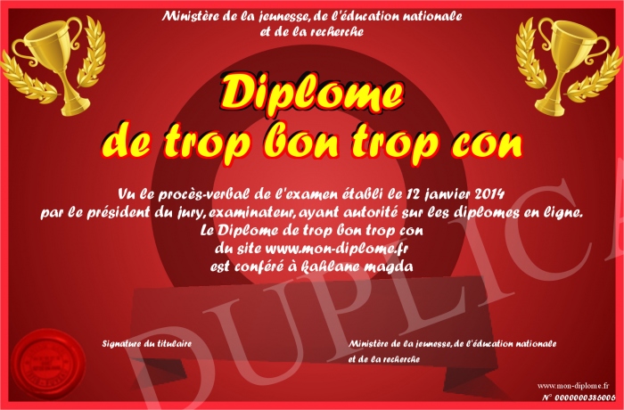 Envoyez par email votre Diplôme de trop bon trop con personalisé