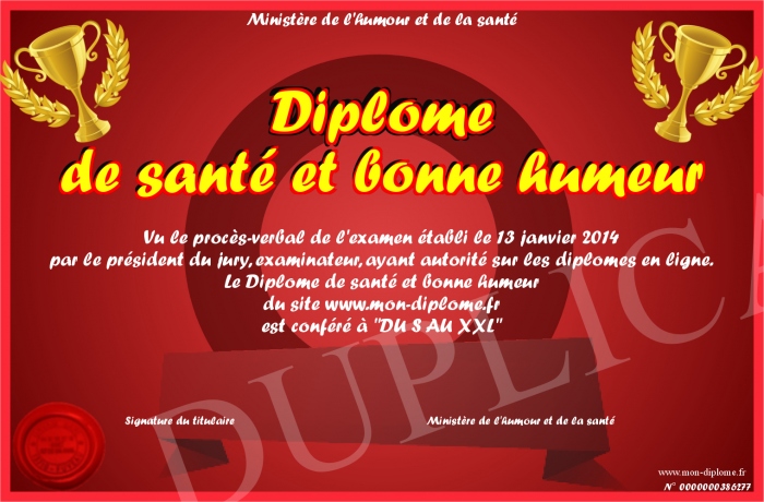 Envoyez par email votre Diplôme de santé et bonne humeur personalisé