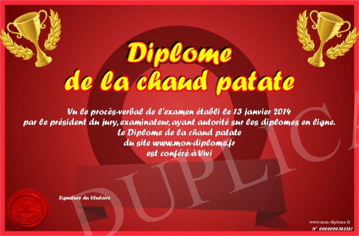 Envoyez par email votre Diplôme de la chaud patate personalisé