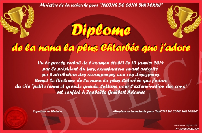 Envoyez par email votre Diplôme de la nana la plus Chtarbée que j'adore personalisé
