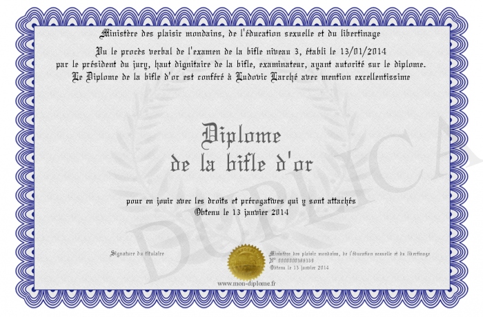 Envoyez par email votre Diplôme de la bifle d'or personalisé