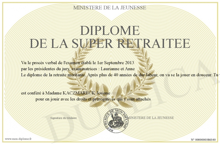 Envoyez par email votre Diplome de la Super Retraitée personalisé