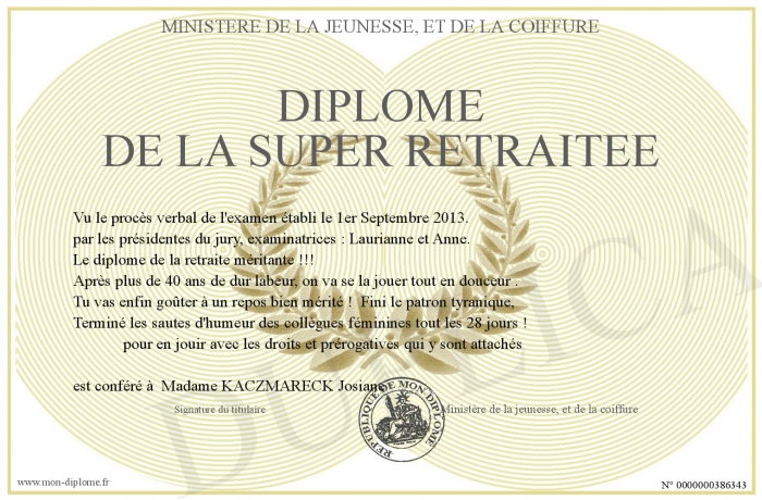 Envoyez par email votre Diplôme de la Super Retraitée personalisé