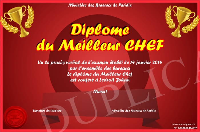 Envoyez par email votre Diplôme du Meilleur CHEF personalisé