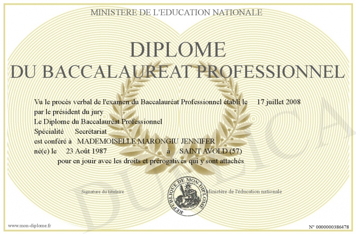Envoyez par email votre Diplôme du Baccalauréat Professionnel personalisé