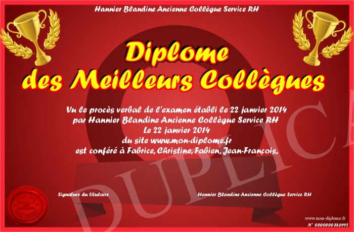 Envoyez par email votre Diplôme des Meilleurs Collègues personalisé