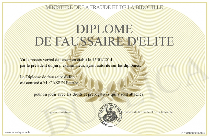 Envoyez par email votre Diplôme de faussaire d'élite personalisé