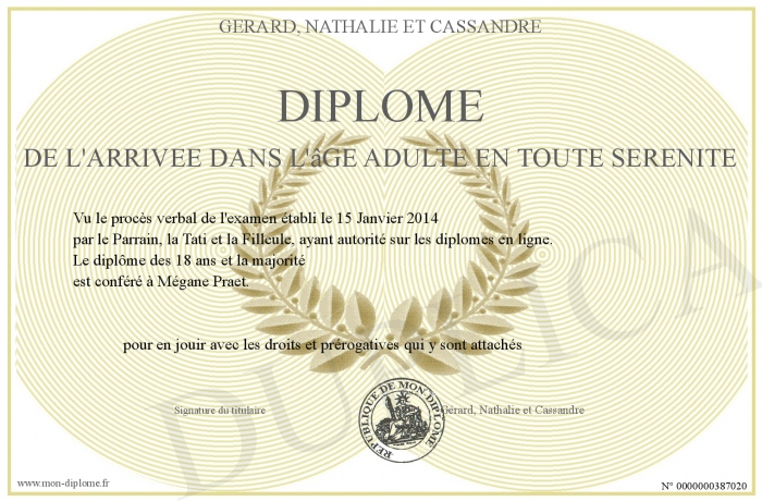 Envoyez par email votre Diplôme de l'arrivée dans l'âge adulte en toute sérénité personalisé
