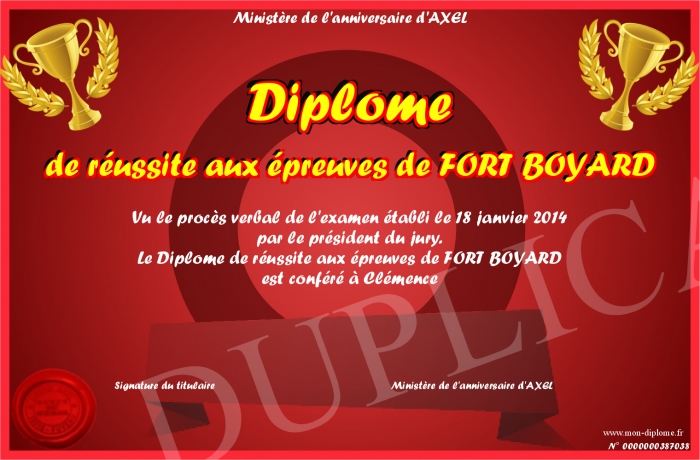 Envoyez par email votre Diplôme de réussite aux épreuves de FORT BOYARD personalisé