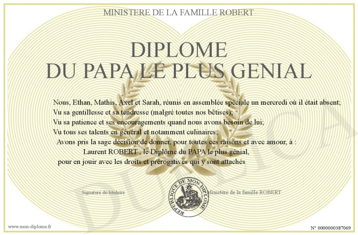 Envoyez par email votre Diplôme du Papa le plus Génial personalisé