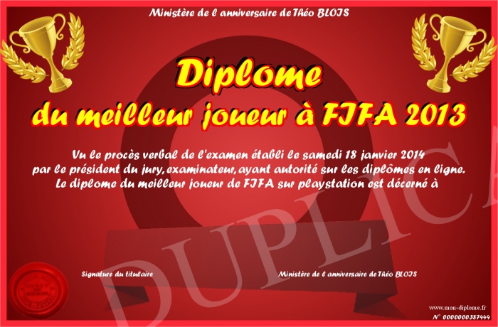 Envoyez par email votre Diplôme du meilleur joueur à FIFA 2013 personalisé