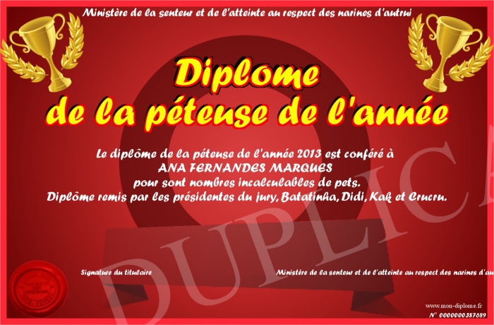 Envoyez par email votre Diplôme de la péteuse de l'année personalisé