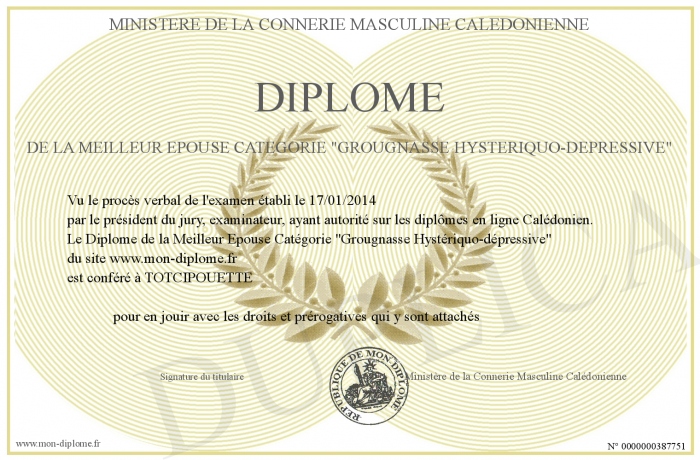 Envoyez par email votre Diplôme de la Meilleur Epouse Catégorie -Grougnasse Hystériquo-dépressive- personalisé