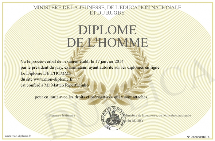 Envoyez par email votre Diplôme DE L'HOMME personalisé