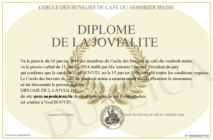 Envoyez par email votre Diplôme de la jovialité personalisé