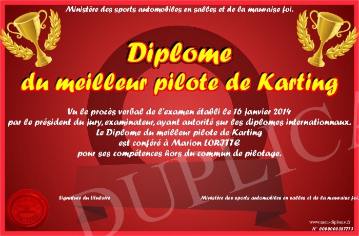 Envoyez par email votre Diplôme du meilleur pilote de Karting personalisé