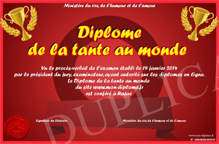 Envoyez par email votre Diplome de la tante au monde personalisé