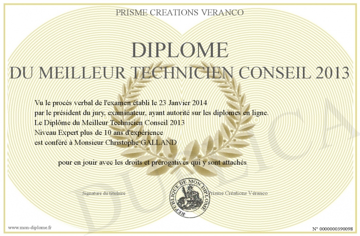 Envoyez par email votre Diplome du Meilleur Technicien Conseil 2013 personalisé