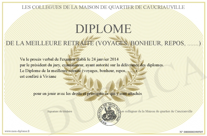 Envoyez par email votre Diplôme de la meilleure retraite (voyages, bonheur, repos, .......) personalisé