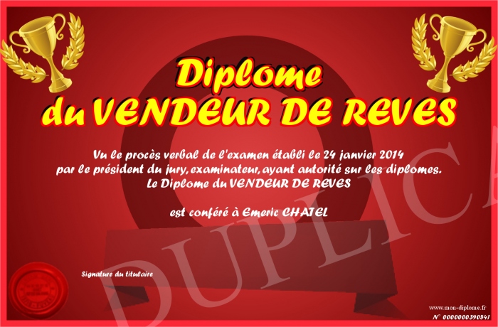 Envoyez par email votre Diplôme du VENDEUR DE REVES personalisé