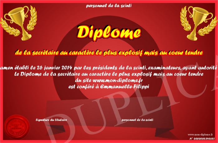 Envoyez par email votre Diplôme de la secrètaire au caractère le plus explosif mais au coeur tendre personalisé