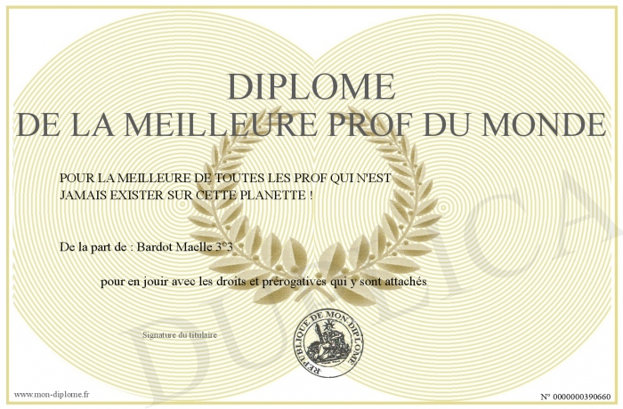 Envoyez par email votre Diplôme de la meilleure prof du monde personalisé