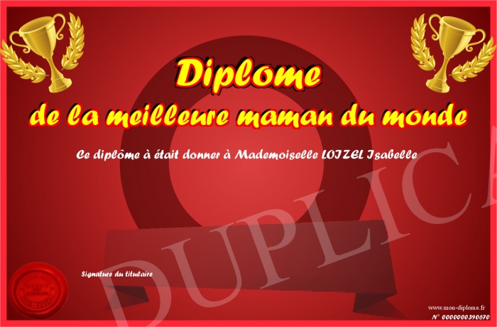 Envoyez par email votre Diplôme de la meilleure maman du monde personalisé