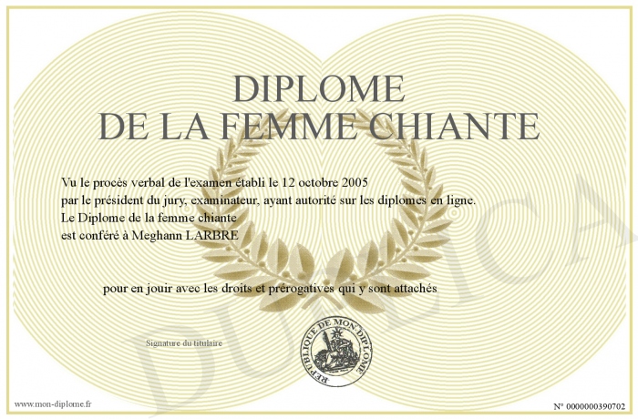 Envoyez par email votre Diplôme de la femme chiante personalisé