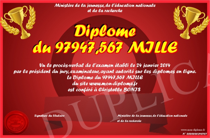 Envoyez par email votre Diplôme du 97947,567 MILLE personalisé