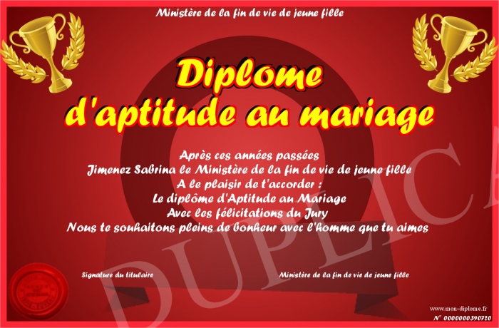 Envoyez par email votre Diplome d'aptitude au mariage personalisé