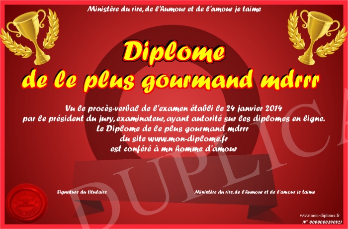 Envoyez par email votre Diplome de le plus gourmand mdrrr personalisé