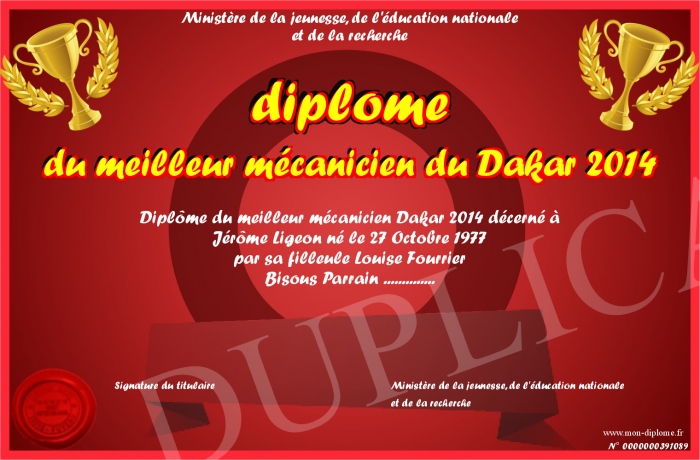 Envoyez par email votre diplôme du meilleur mécanicien du Dakar 2014 personalisé