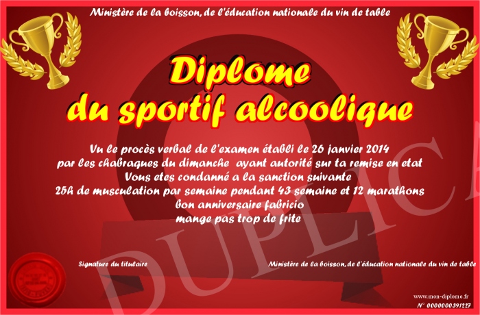 Envoyez par email votre Diplôme du sportif alcoolique personalisé