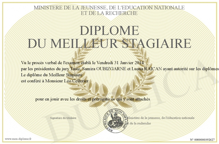 Envoyez par email votre Diplôme du Meilleur Stagiaire personalisé