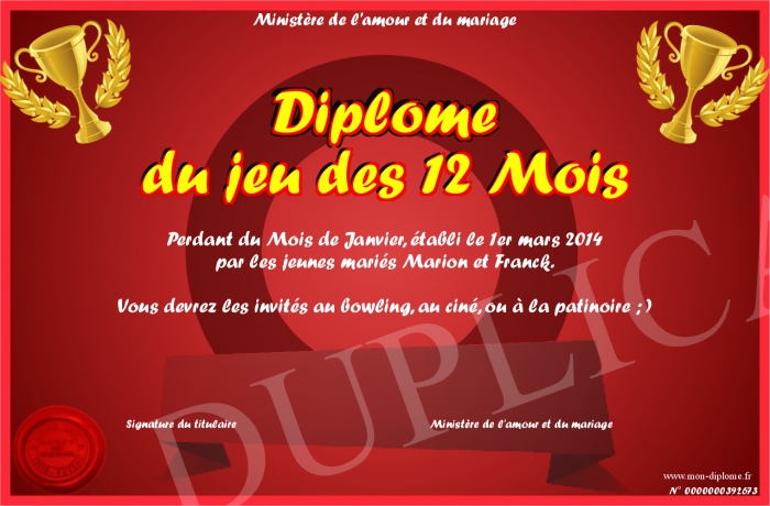 Envoyez par email votre Diplôme du jeu des 12 Mois personalisé
