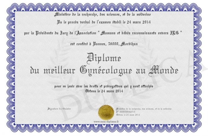 Envoyez par email votre Diplôme du meilleur Gynécologue au Monde personalisé