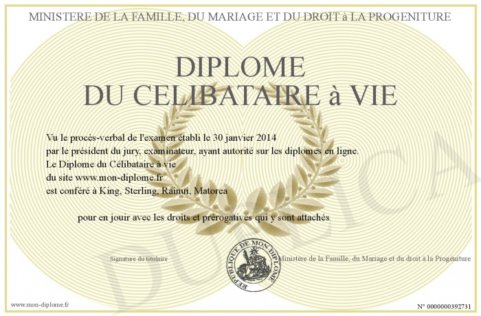 Envoyez par email votre Diplôme du Célibataire à vie personalisé