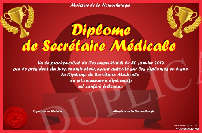 Envoyez par email votre Diplôme de Secrétaire Médicale personalisé