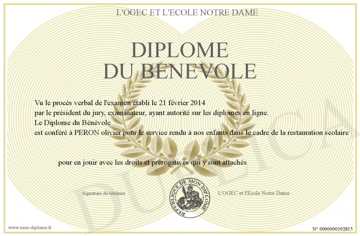 Envoyez par email votre Diplôme du Bénévole personalisé