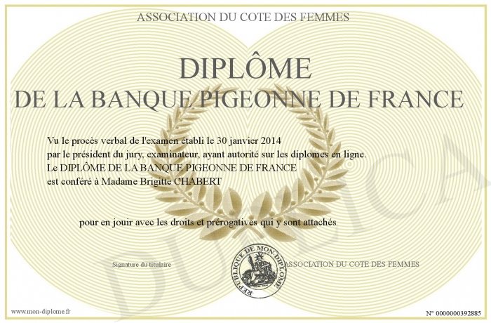 Envoyez par email votre DIPLÔME DE LA BANQUE PIGEONNE DE FRANCE personalisé