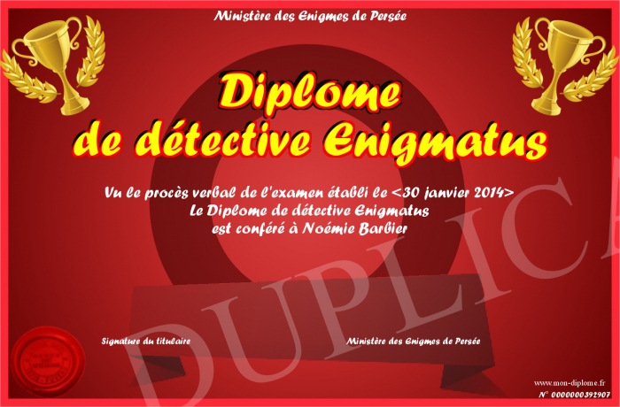 Envoyez par email votre Diplôme de détective Enigmatus personalisé