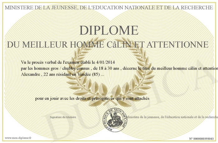 Envoyez par email votre Diplôme du meilleur homme câlin et attentionné personalisé