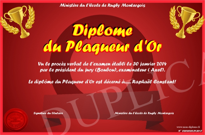 Envoyez par email votre Diplôme du Plaqueur d'Or personalisé