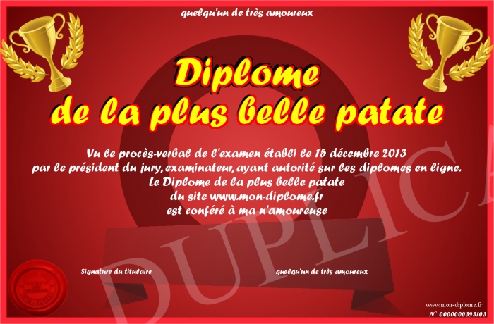 Envoyez par email votre Diplôme de la plus belle patate personalisé