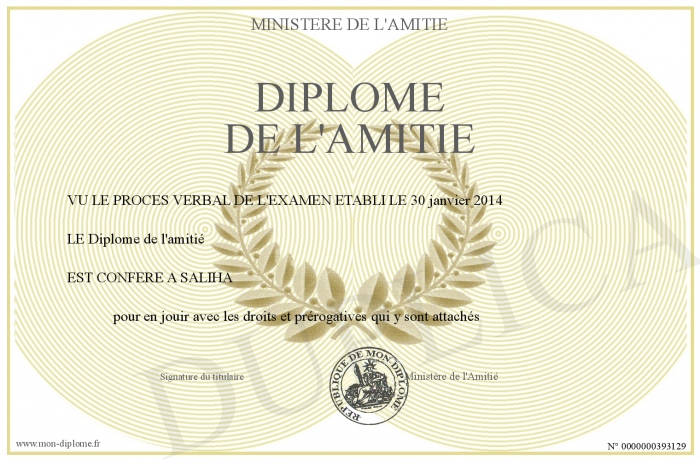 Envoyez par email votre Diplôme de l'amitié personalisé