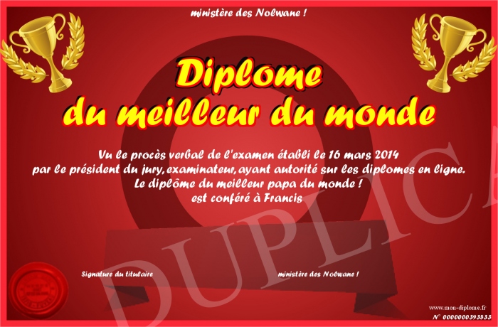 Envoyez par email votre Diplôme du meilleur du monde personalisé