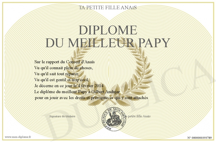 Envoyez par email votre Diplôme du meilleur papy personalisé
