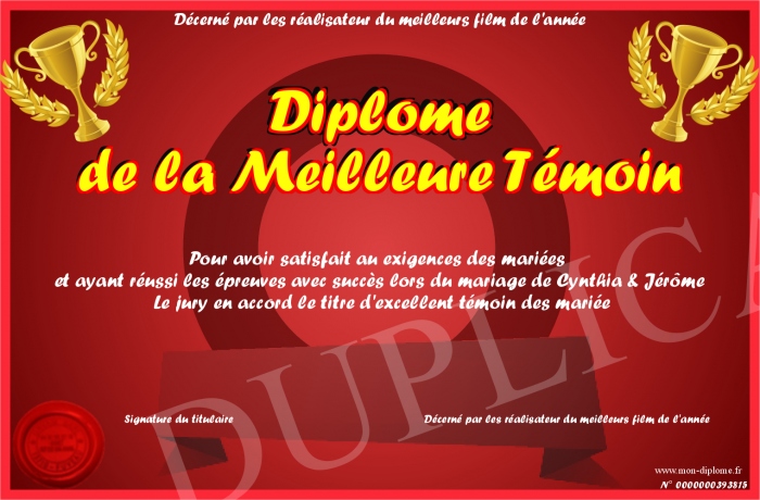 Envoyez par email votre Diplôme de la Meilleure Témoin personalisé